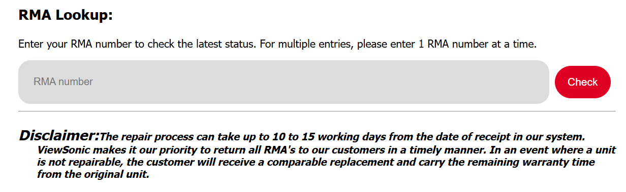 - Click HERE to check on your RMA. If you are experiencing an issue opening the link, copy and paste the following URL, https://www.viewsonic.com/us/rma-lookup, into your browser.