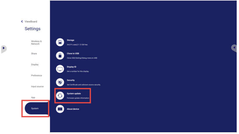 8. Once the unit reboot and returns to the ViewSonic Home screen, verify the unit's firmware version in the About Device. Go to Settings > System > About Device