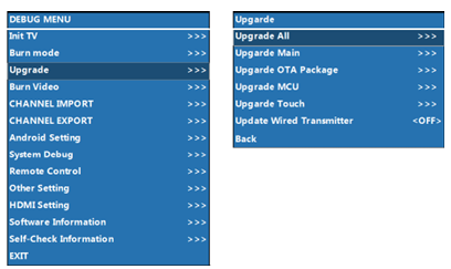 - Using the remote control, press INPUT 9 9 1 to open the Factory Debug Menu.