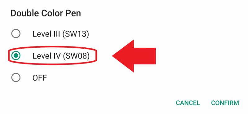 - Set the Double Color Pen Setting from Level III (SW13) to Level IV (SW08).